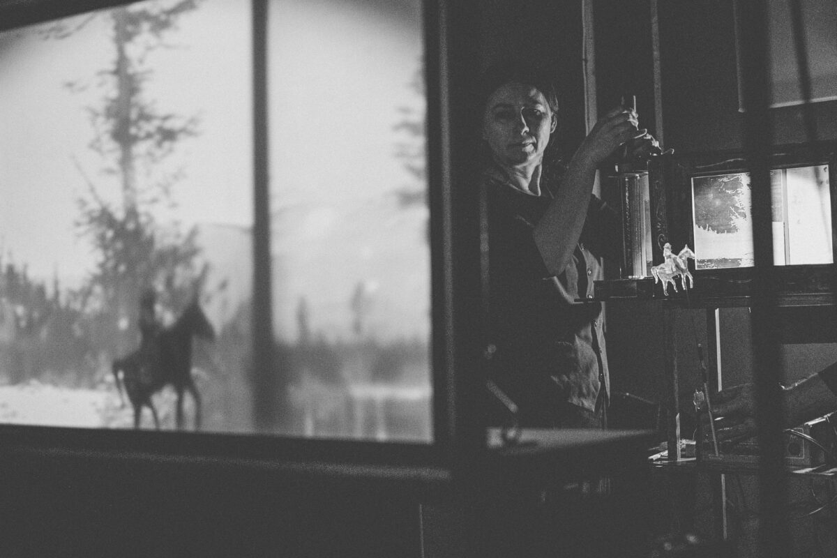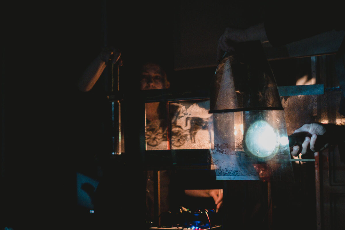 Spektakl jest zrealizowany w autorskiej technice kina manualnego. Rolka filmowa jest wprawiana w ruch przez dłonie aktora, a na ekranie występują lalki cieniowe. Bardzo ciekawym zabiegiem jest również kreacja pola gry – miejsca, w którym realizujemy spektakl. Widowisko pokazywane jest w przygotowanej specjalnie do tego celu przyczepie teatralnej – naszym kino-teatrze na kółkach, z którym podróżujemy do kolejnych miejsc realizacji. Widzów zapraszamy do środka przyczepy. Zamknięcie publiczności w małej przestrzeni sprzyja wywołaniu wrażenia przebywania widzów w gabinecie strachów i potęguje emocje…. I obawę przed zarazą, która jest na zewnątrz.